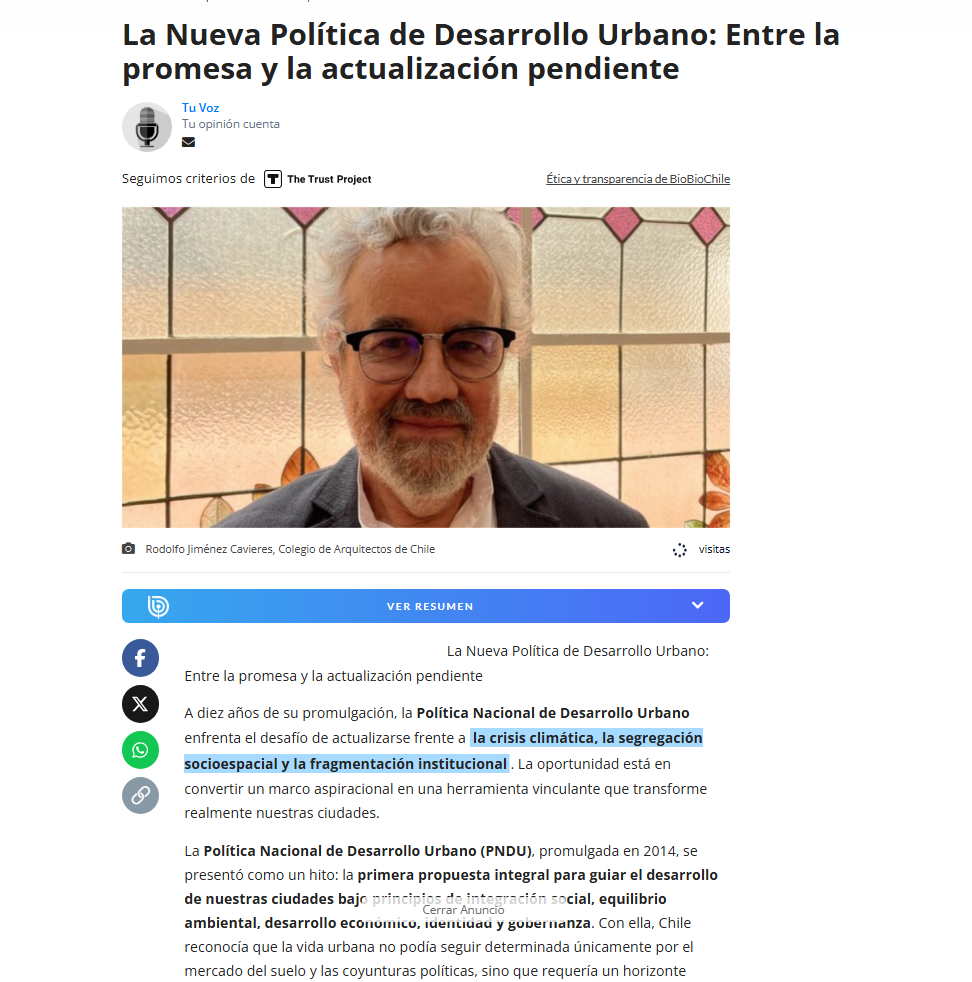 Rodolfo Jiménez, presidente nacional del Colegio de Arquitectos de Chile y consejero del CNDT, reflexiona sobre los 10 años de la Política Nacional de Desarrollo Urbano (PNDU) y la urgencia de su actualización en su columna de opinión publicada el 10 de septiembre en Bío Bío.