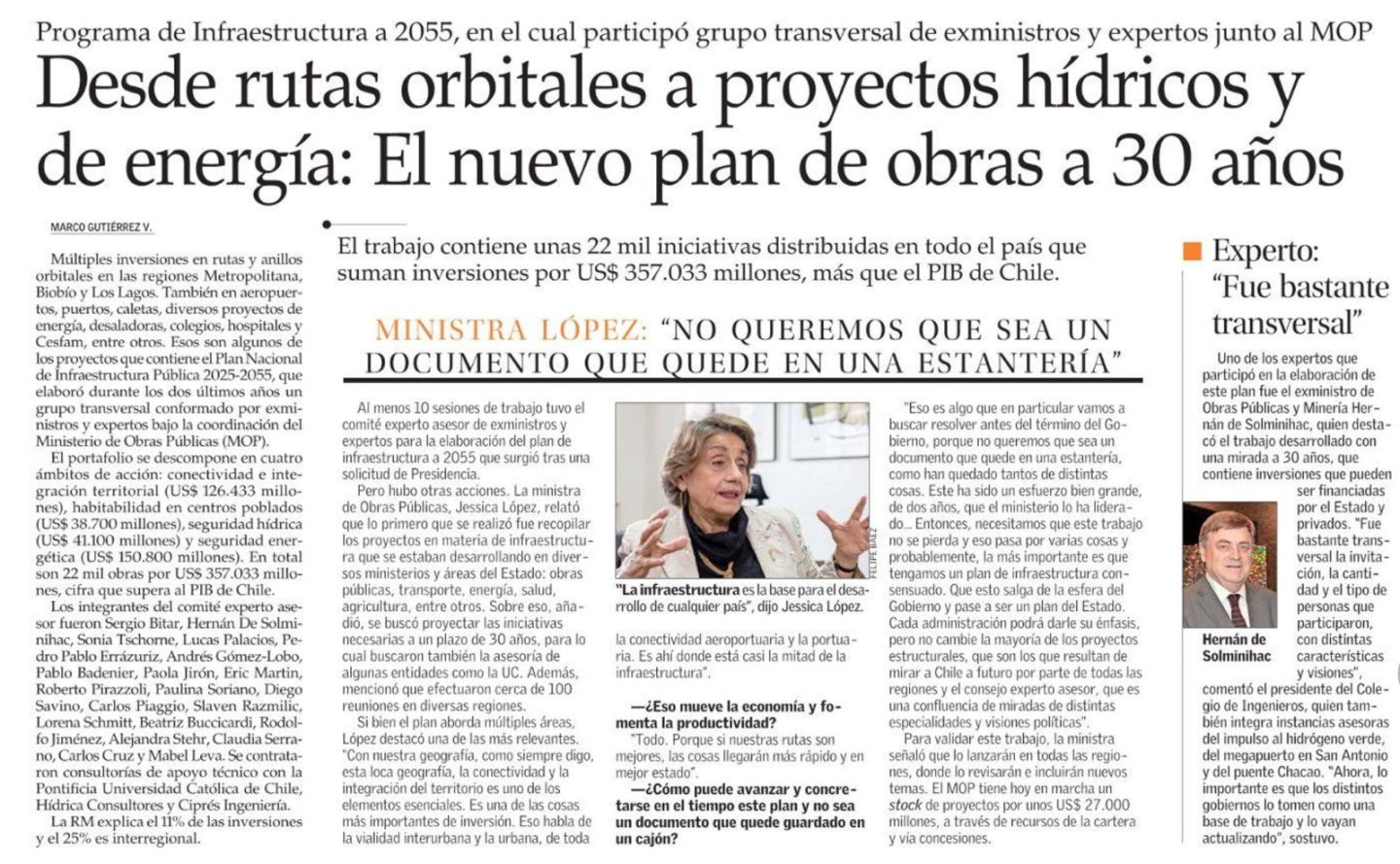 El Ministerio de Obas Publicas presentó el Plan Nacional de Infraestructura Pública 2025–2055, que contempla más de 22 mil iniciativas en todo el país, con una inversión estimada de US$ 357.033 millones. El plan —elaborado junto a un comité transversal de exministros y expertos— considera proyectos de conectividad, seguridad hídrica y energética, y habitabilidad urbana, como rutas orbitales, aeropuertos, hospitales, colegios y plantas desaladoras, con el objetivo de fortalecer el desarrollo territorial y mejorar la calidad de vida de la población.